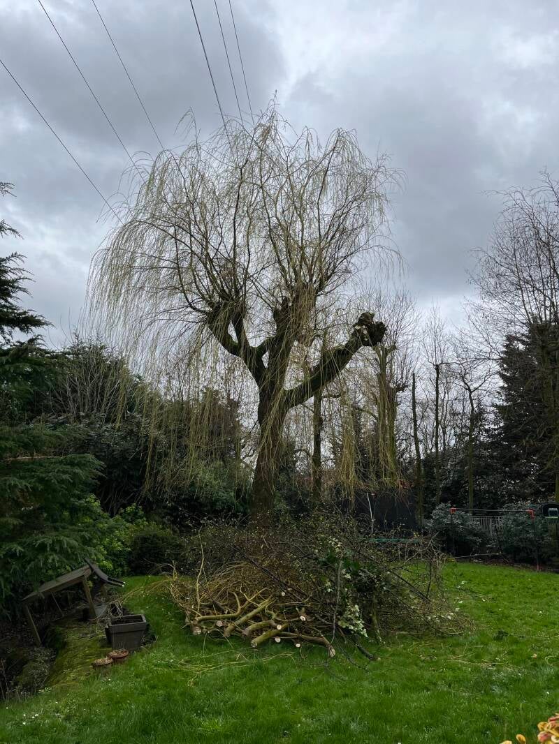Boomverzorging van verschillende bomen in achtertuin woning.
