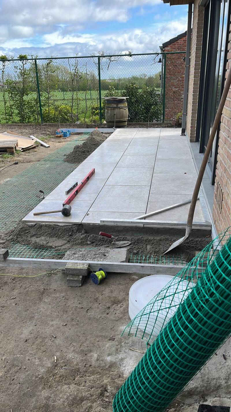 Deze nieuwe terras in wildverband met volkeramische tegels 60x90 cm werd aangelegd in Moorslede. Voor de afwatering van het terras werd gekozen voor een stijlvolle afvoergoot met cortenstaal rooster.