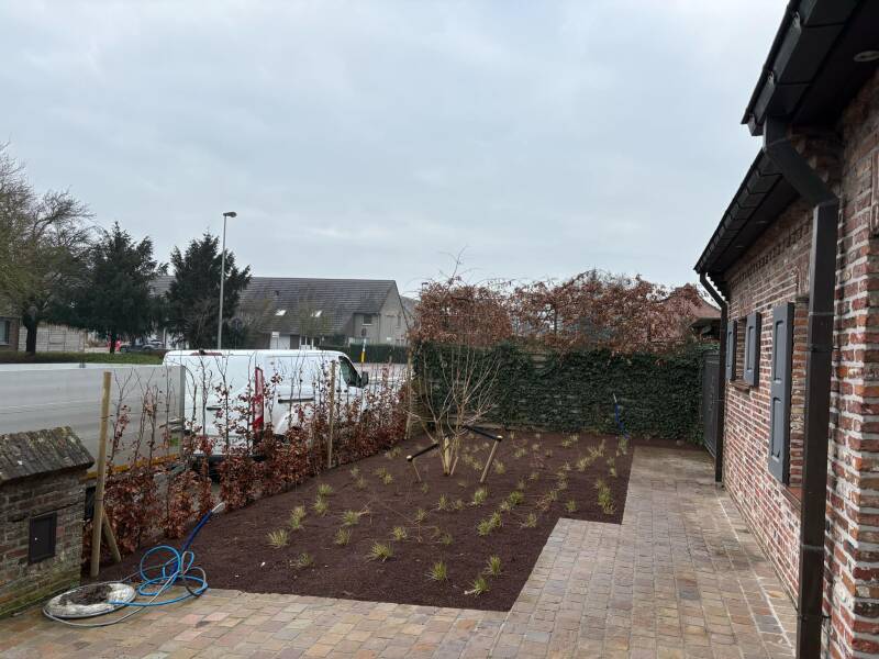 In de voortuin werd de taxushaag verwijderd en vervangen door een nieuwe Fagus sylvatica. De kavel werd proper gemaakt en genivelleerd. Daarna hebben we de voortuin voorzien van een druppelirrigatie. Centraal werd een meerstam geplant met daarrond vaste planten. Tenslotte werd de voorkavel afgewerkt met lavasteentjes.