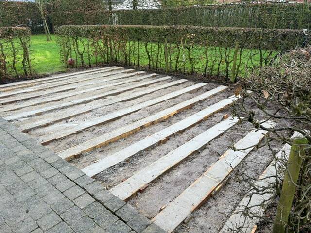 De oude bankirai terras had zijn tijd gehad. De worteldruk van de aanwezig boom zorgde eveneens voor beschadiging aan de fundering onder de terras met oneffenheden tot gevolg.